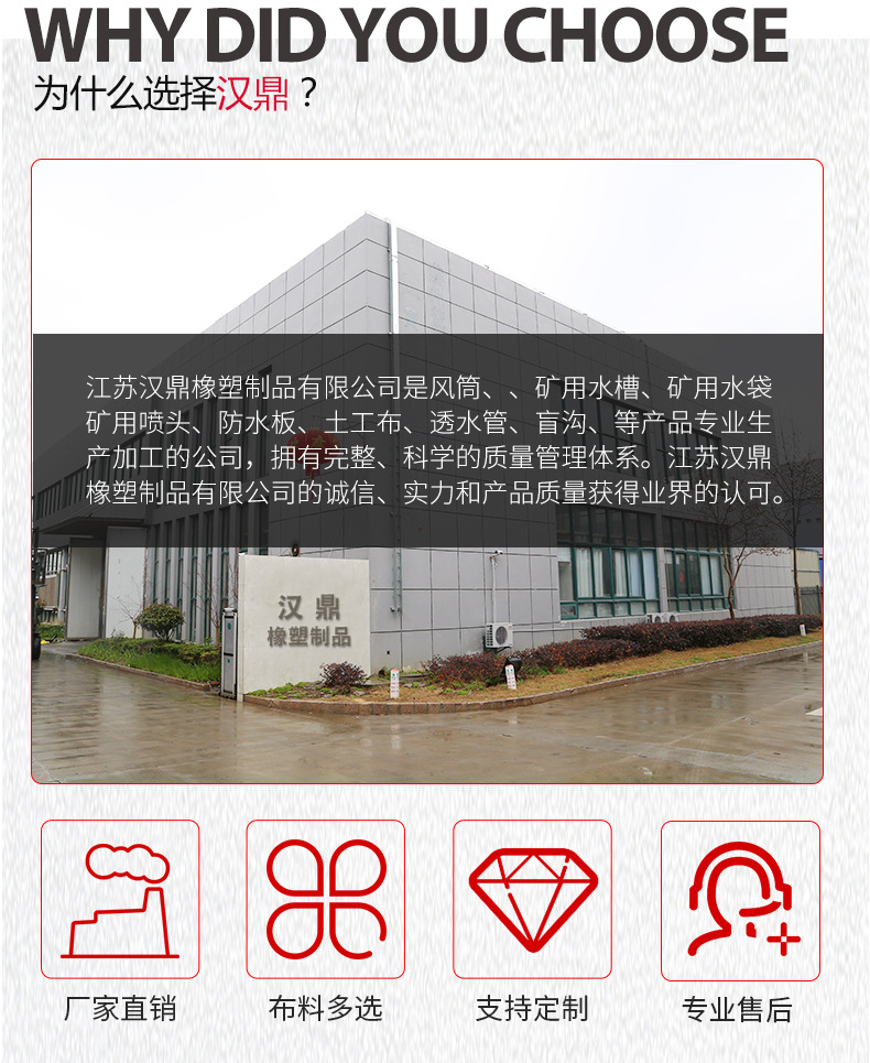 江蘇漢鼎橡塑制品有限公司是一家專業(yè)從事TBM風筒、防水卷材、除塵布袋生產(chǎn)銷售安裝維護綜合型企業(yè),漢鼎公司始終堅持以客戶為中心,以環(huán)保為己任為國內(nèi)外眾多企業(yè)項目提供一站式解決方案,主要產(chǎn)品有礦用風筒、工程風筒、改性瀝青防水材料、水槽、水袋、噴頭、防水板、土工布、透水管、盲溝、環(huán)保濾袋等產(chǎn)品,歡迎廣大用戶及業(yè)內(nèi)人士來電詳談。